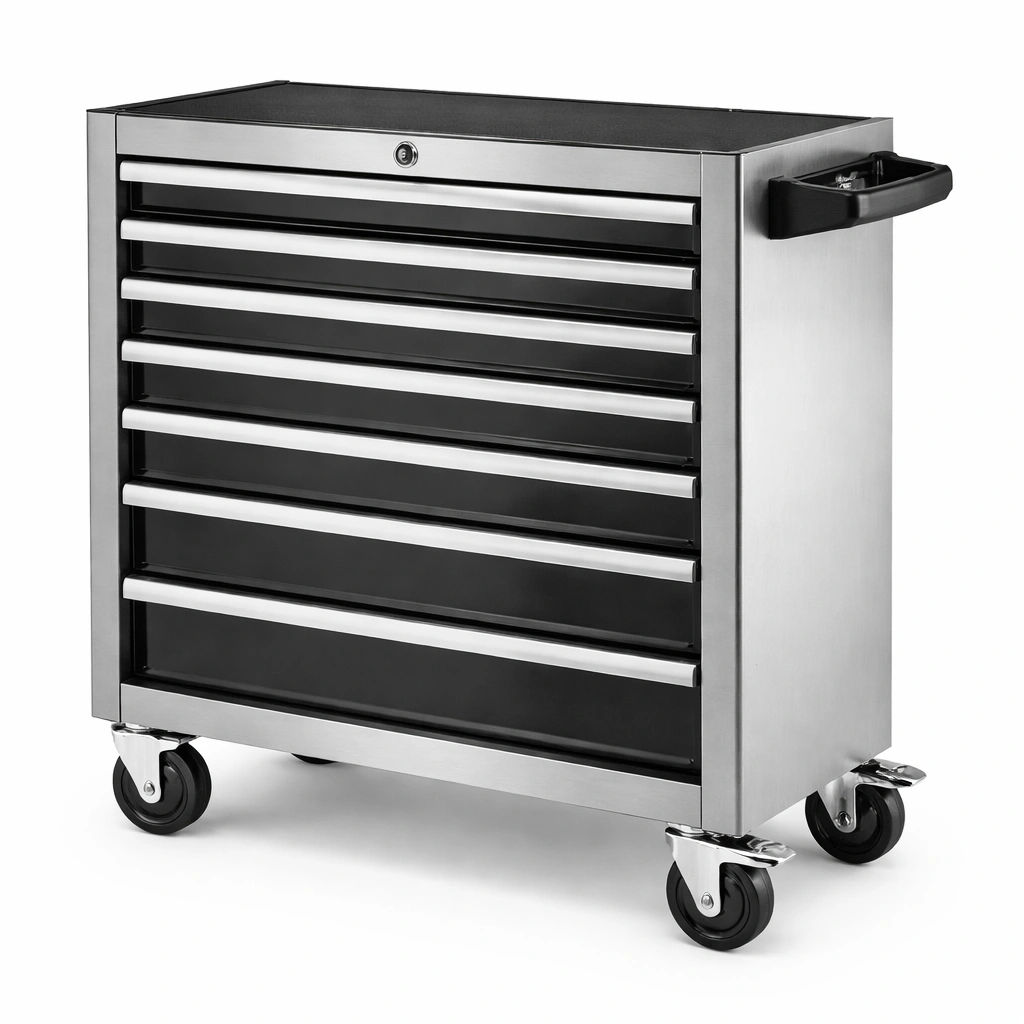 Carro de herramientas con 7 cajones de acero inoxidable negro con ruedas